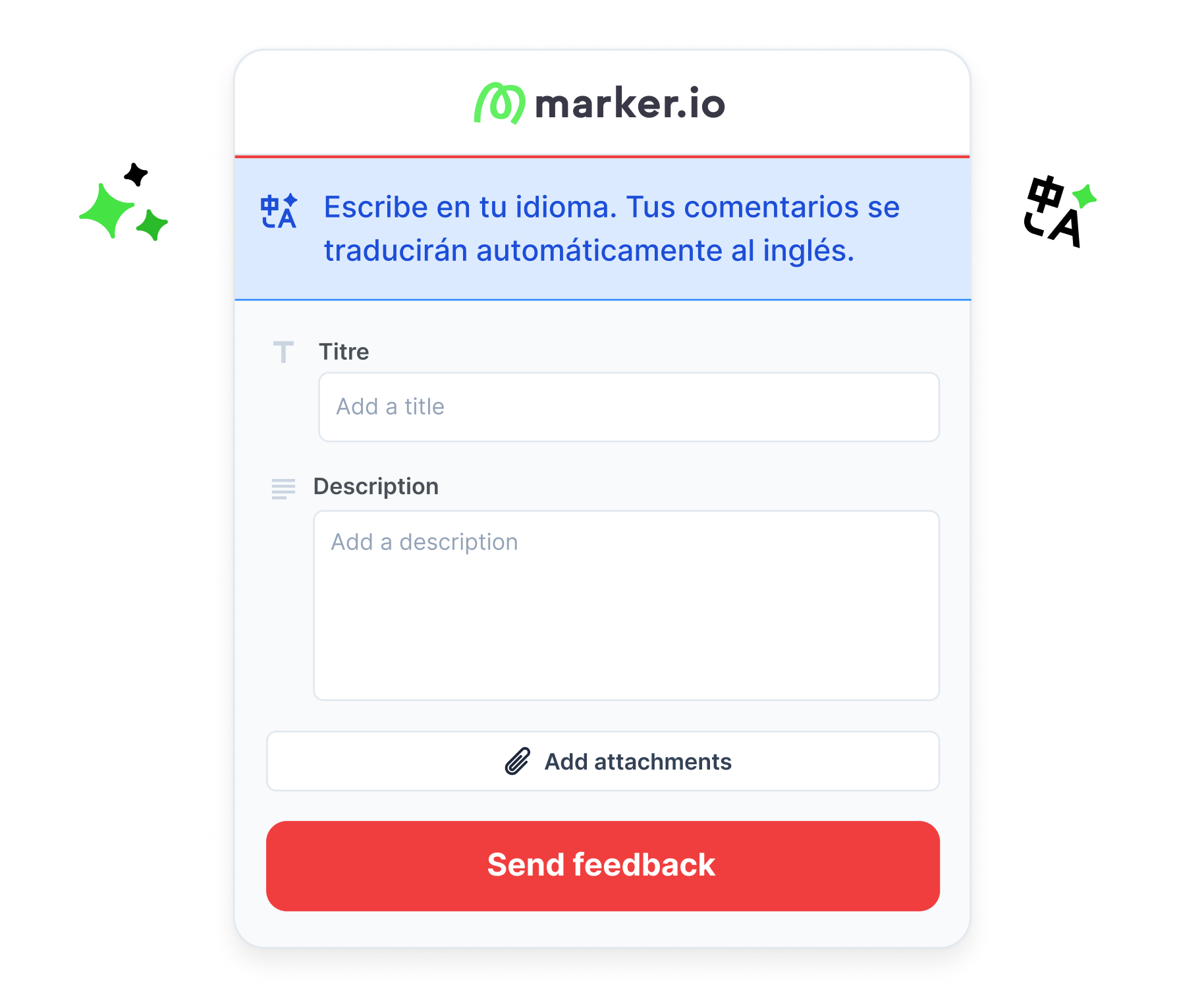 Let reporters write feedback in their own language. Marker.io automatically detects the language and translates the issue title and description into your team's preferred language.